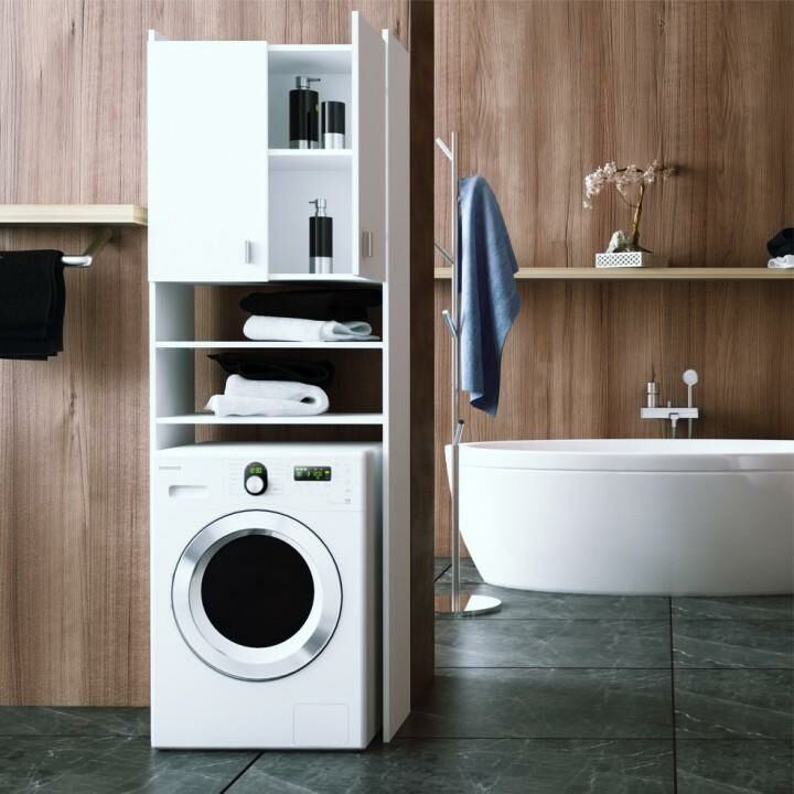 Praktikus kombinált szekrény polcokkal és szárnyas ajtókkal, DTD laminált, mosógép elhelyezésének alkalmas, színváltozat: fehér. Mérete (Szé/Mé/Ma): 64x30x190 cm. A lehető legnagyobb mérete a mosógépnek: 60x85 cm.
