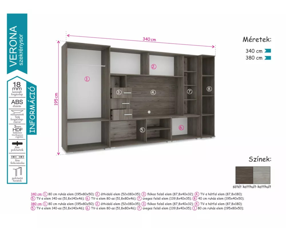 A Verona szekrénysor megjelenésével számos nappali éke lehet. Két méretben érhető el, 340 és 380 cm-es kivitelben. Sötét katthult és katthult színeivel harmónikus összhangot teremt bármely helyiségben. Nagyon jól pakolható, jól tervezett belső tereiben mindennek meglesz a megfelelő helye.