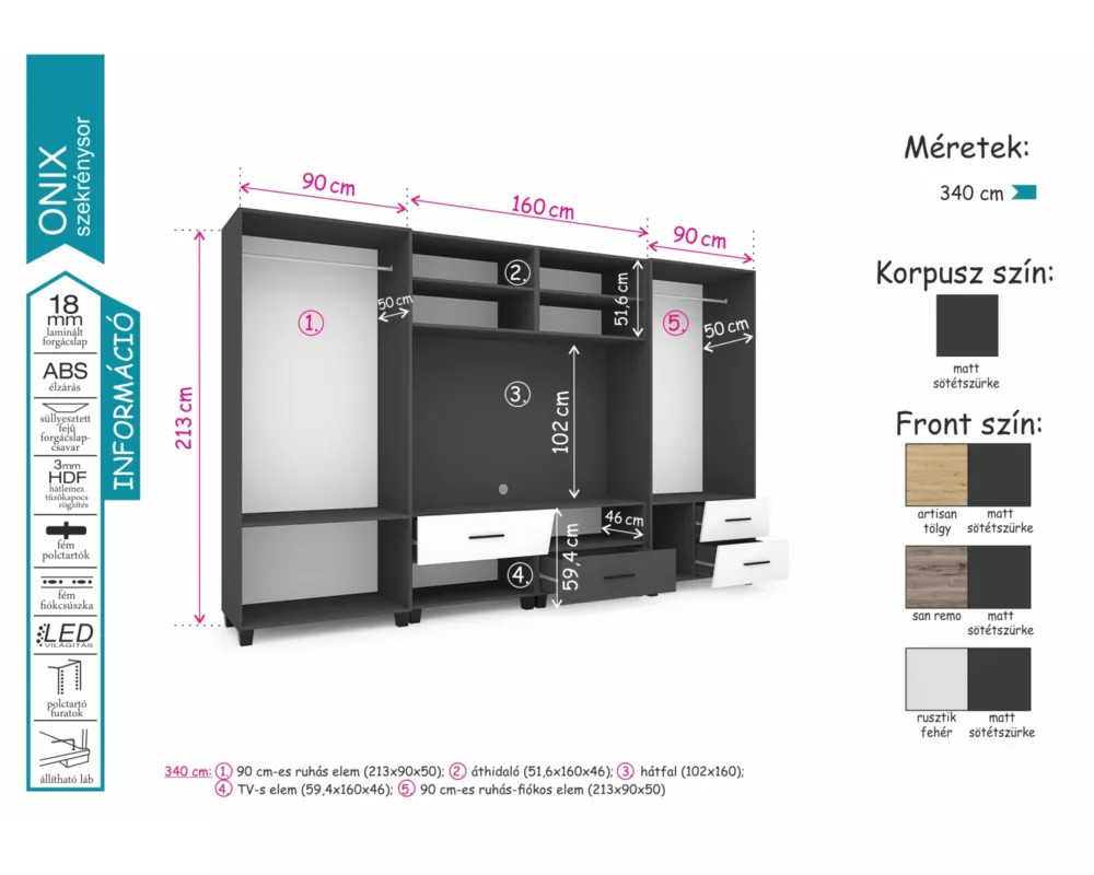Az Onix szekrénysor egy méretben kapható. A 340 centiméteres kivitel jól kihasználható részekből épül fel. A szekrénysor tükörrel és LED világítással is rendelhető. A tükrös ajtók a komfortos öltözködést segítik, és a teret is növelik a hálószobában.